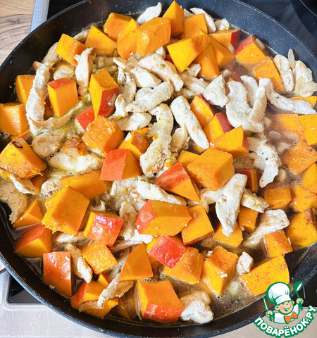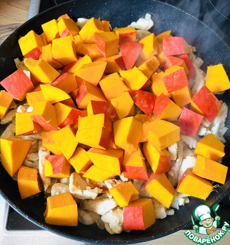 Добавить тыкву, обжарить всё вместе несколько минут.