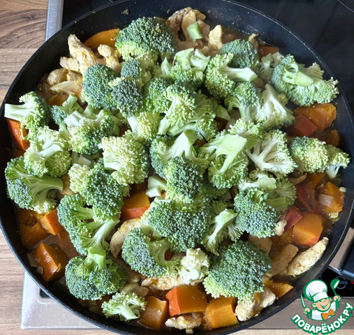 Когда тыква будет готова, добавить брокколи, перемешать и тушить минут 5-7 до готовности брокколи.
