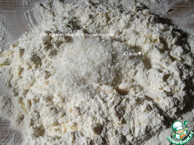 Муку смешайте с разрыхлителем и солью, просейте 2 раза. Сливочное масло порубите с мучной смесью в крошку, переложив на рабочую поверхность, добавьте кокосовую стружку и сахарную пудру, перемешайте.