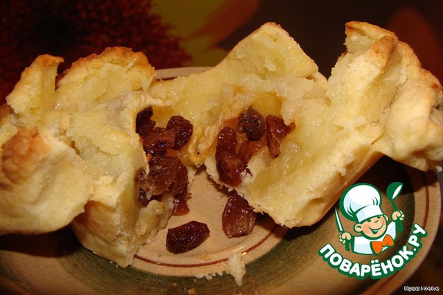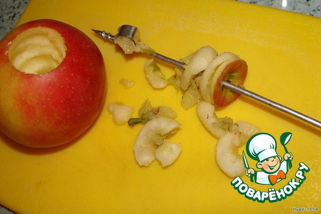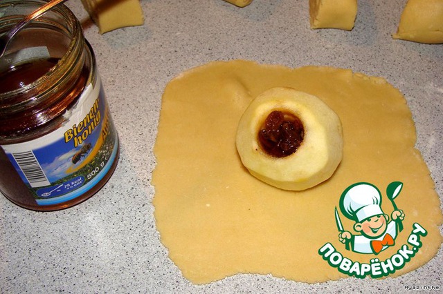 Каждый кусочек раскатать, уложить яблоко и наполнить его распаренным изюмом + 1/2 ч. л. меда