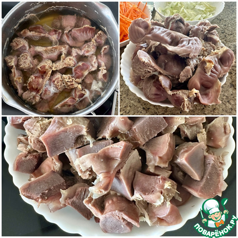 Конечно, желудки хорошо промыл под проточной водой. И, чтобы пупки-желудки получились сочными и нежными, их надо взять … и отварить.