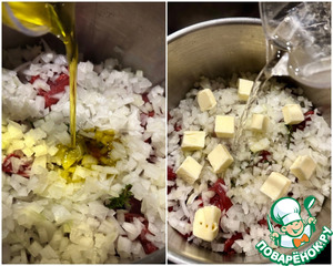 Луковицу мелко порубил и поверх мяса ровненько выложил. Масло. Лучше оливковое. Пару столовых ложек. Коровье (сливочным его еще называют) мелкими кусочками порезал. И вода. Воду я взял горячую, прямо из чайника.