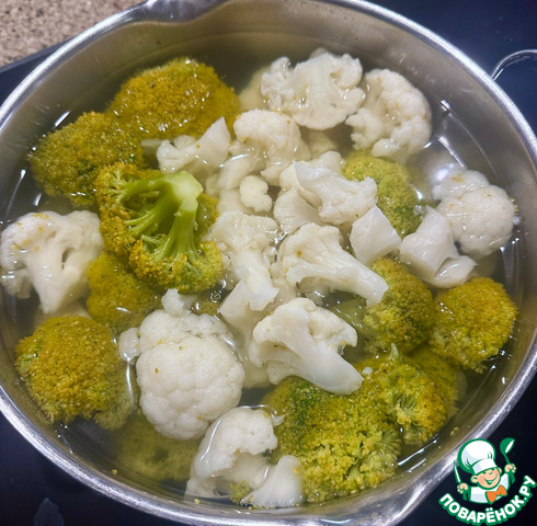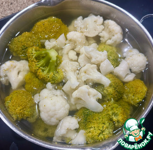 Пока всё вышеописанное происходило, взял я по кочану брокколи и цветной капуст (или правильно «капустов»?) очистил их от всего лишнего, разделил на соцветия, промыл и в кастрюлю, но другую, конечно сложил. Водой залил, слегка подсолил, поставил на плиту. Довел до кипения и на умеренном нагреве оставил вариться. До, что называется, готовности.