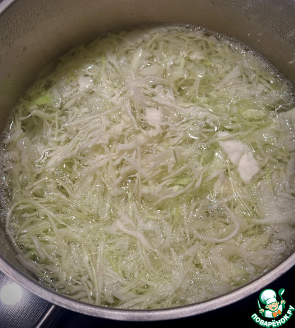 Залил капусту горячей водой, довел за закипания, нагрев на минимум и просто хорошо прогрел-притомил. Буквально три минуты. Потом на дуршлаг откинул.