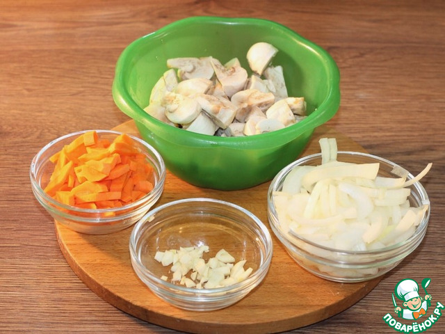 И нарезаем: грибы - дольками, лук - полукольцами, морковь - брусочками и мелко рубим чеснок. -