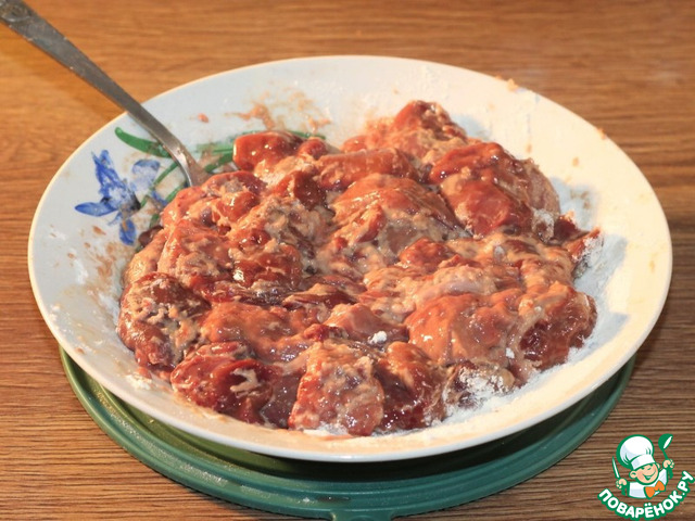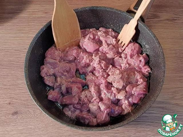3. Куриную печень моем, удаляем жир и протоки, разрезаем на две-три части. Обваливаем каждый кусочек в муке (3-4 ст. л.)