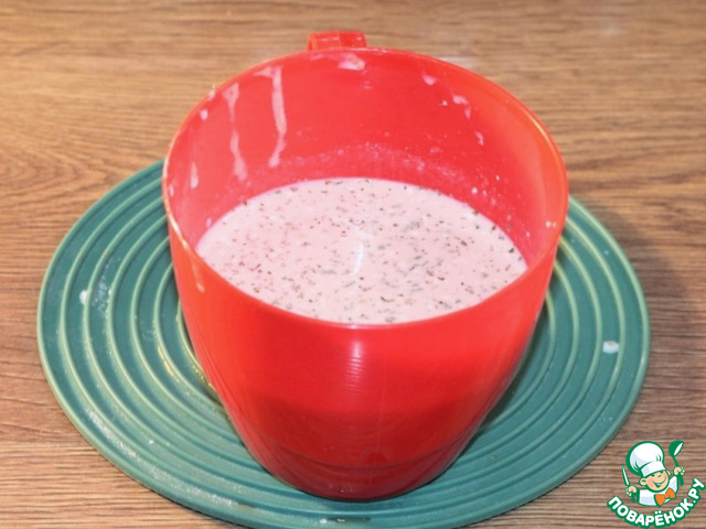 5. Приготовим заливку. В посуду, где была печень, вливаем теплое молоко (150 мл) и смываем мучные кусочки. Затем сливаем смесь в другую посуду. Добавляем сметану, томатный кетчуп (или пасту 1 ст. л.). Всыпаем специи и взбиваем венчиком. Специи у меня с добавлением пряных трав и сухих - чеснока и лука.