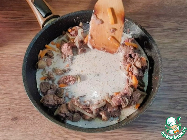 9. Вливаем соус. Если Вы любите, когда печень в большом количестве соуса, то можно добавить еще молоко (150 мл). Всыпаем по вкусу специи и перемешивая, доводим соус до небольшого загустения. Степень загустения на Ваш вкус.