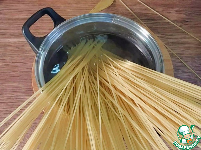 10. На гарнир у меня спагетти. Отвариваем их согласно инструкции на упаковке в подсоленной воде.
