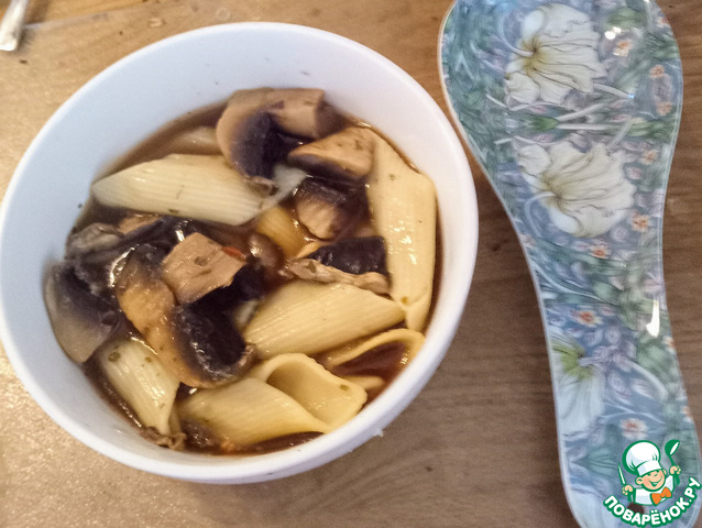 Соедините грибной суп с макаронными изделиями. Разложите по блюдам. Можно подавать. Приятного аппетита.