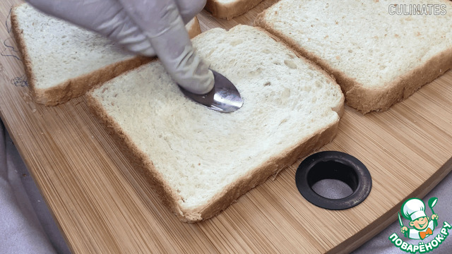 Теперь нам понадобится четыре ломтика тоста, в которых мы с помощью ложки сделаем углубления, как на фото.