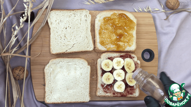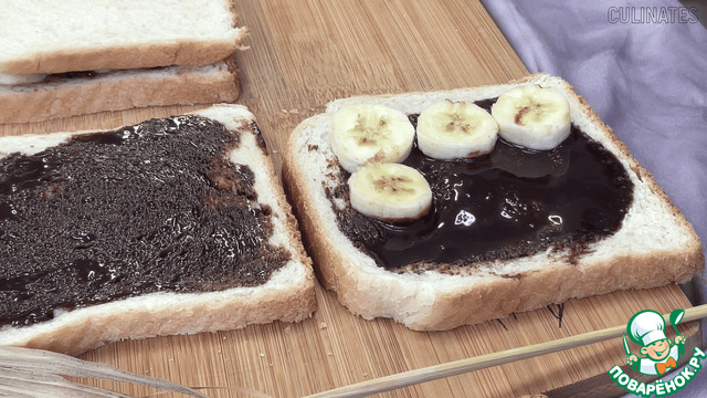Намажьте два других ломтика хлеба шоколадом и положите сверху банан.