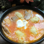 Тем временем смешайте муку и яйца. Добавьте одну чайную ложку соли. В отдельной ёмкости разогрейте воду и с помощью чайной ложки выкладывайте смесь для клецок в кипящую воду. Варите 3 минуты или пока клецки, осевшие на дне, не всплывут на поверхность. Добавьте клецки к соусу из томатов и паприки.
