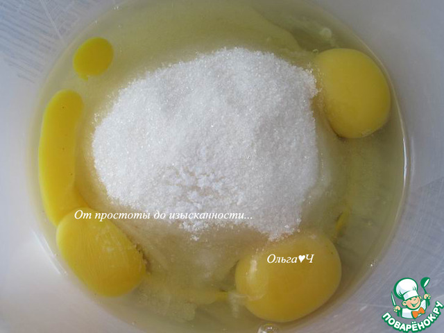 Яйца соедините с сахаром и растительным маслом в чаше для взбивания.