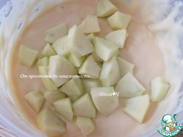 Половину яблок очистите, нарежьте кусочками и сразу добавляйте в тесто, чтобы не потемнели.