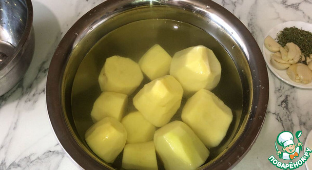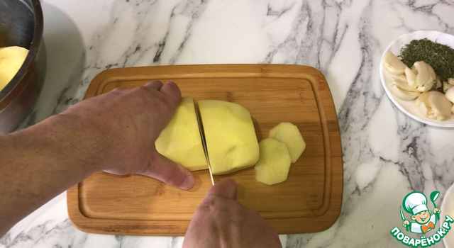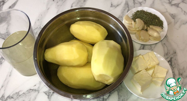 Подготовьте все ингредиенты. Картофель очистите и помойте. Зубчики чеснока очистите и раздавите. Духовку включите на 190°C.