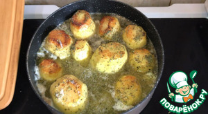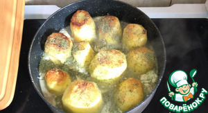 Когда картошечка обжарится, добавьте сливочное масло. Дождитесь пока оно растопится. Затем добавьте чеснок и тимьян. Готовьте 1 минуту, поливая картошечку маслом.