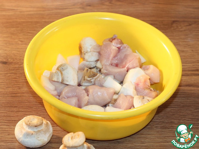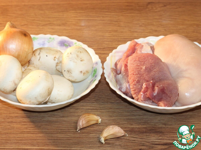 4. Лук и грибы очистила и крупно нарезала. Чеснок резать не надо.