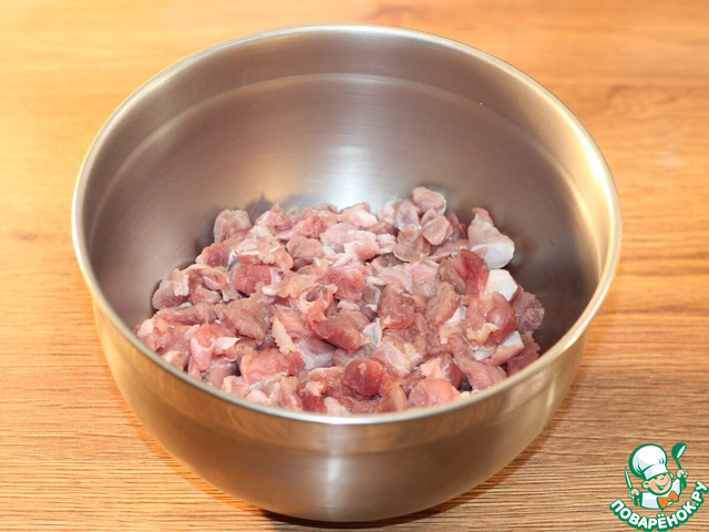 Приготовление мясной смеси: Около 2/3 мяса нарежьте небольшими кубиками размером ок.