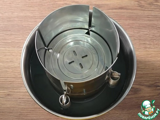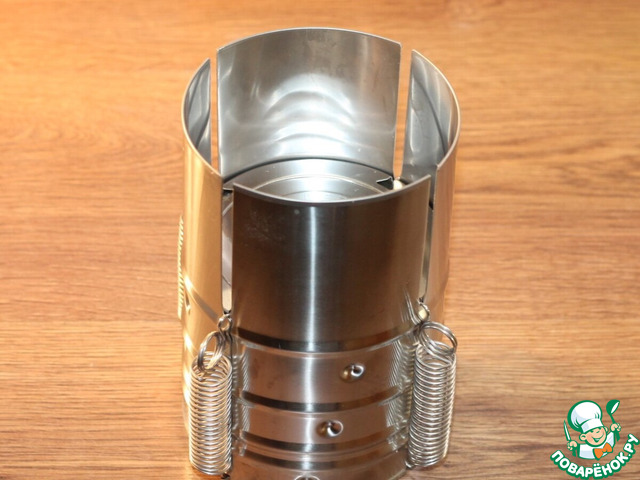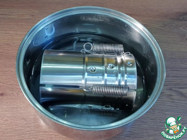 8. На следующий день, вставила в ветчинницу прозрачный пакет для духовки (рукав). И плотно заполнила его массой. Подкрутила кончик пакета и закрыла ветчинницу крышкой. Закрепила пружины.