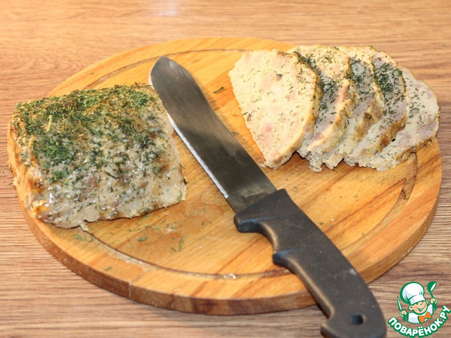 10. Затем извлекла ветчинницу, измерила температуру ветчины (середину), должна быть 70 С и поставила в холодную воду. А когда немного остыла ветчина, извлекла ее из ветчинницы, разрезала и попробовала.