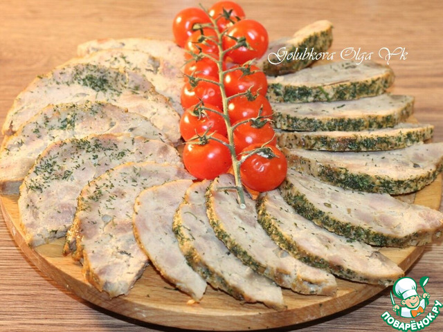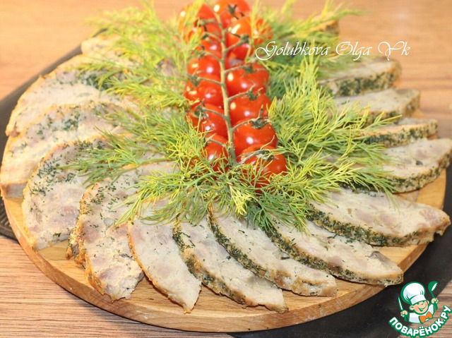 верхнего края, после добавления каждого слоя смесь хорошо спрессовывайте. Ветчинницу закрой-