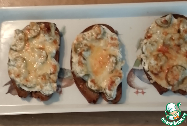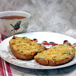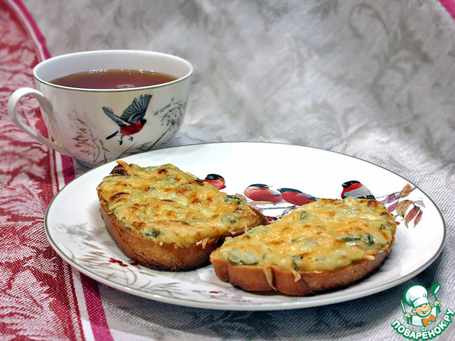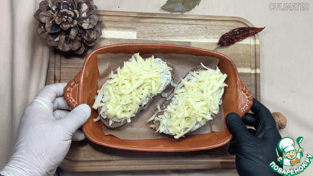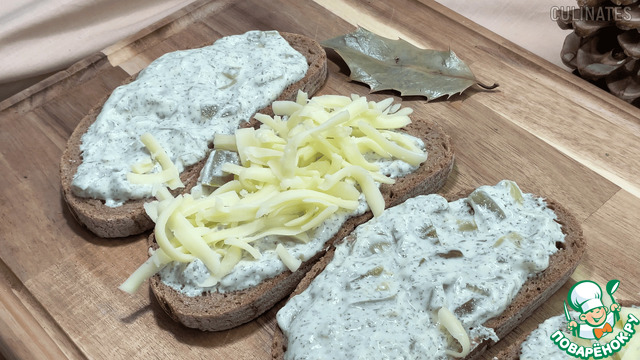 Теперь намажьте нашей смесью четыре ломтика хлеба, посыпьте тертым сыром и положите один ломтик на другой.