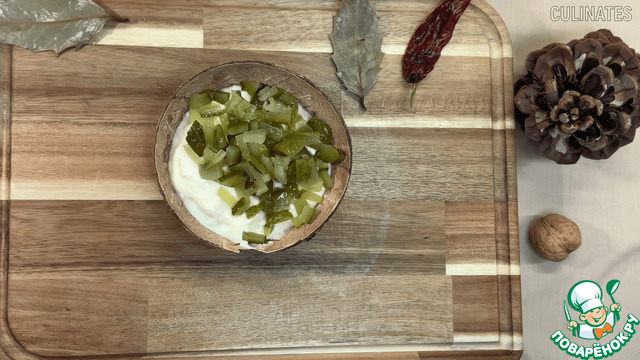 Поместите йогурт, домашний майонез, маринованные огурцы и чеснок в миску.