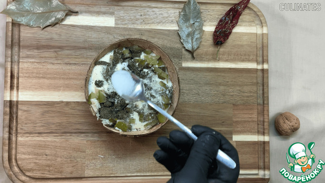 Добавьте сушеный укроп, соль, перец и перемешайте.