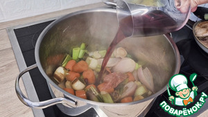 К овощам добавить вино, потушить с вином минут пять, потом влить бульон.