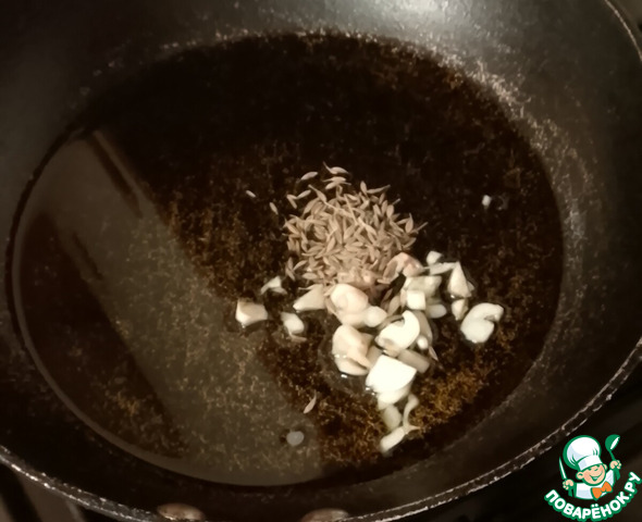 В глубоком казане на среднем огне разогреть оливковое масло, добавить харису, зиру и чеснок. Готовить, помешивая, 3-4 минуты, до того как чеснок утратит свой резкий запах.
