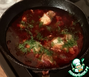 Используя обратную сторону ложки, сделать 4 углубления в соусе. В них вбить яйца. Накрыть крышкой и готовить 2-3 минуты до готовности белков. Желтки должны оставаться жидкими. Посыпать свежей зеленью, полить лимонным соком.
