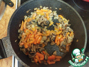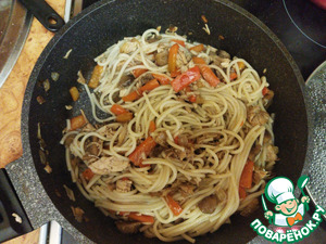 Выложить на сковороду отвареную лапшу. И немного потушить.
