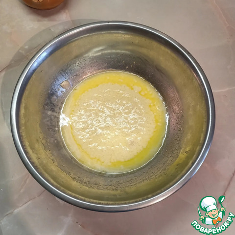 Затем добавить туда сахар, дрожжи и растопленное масло. Оставить на 10-15мин для активации дрожжей.
