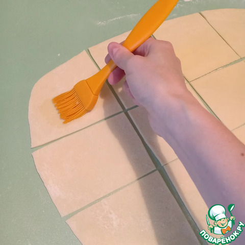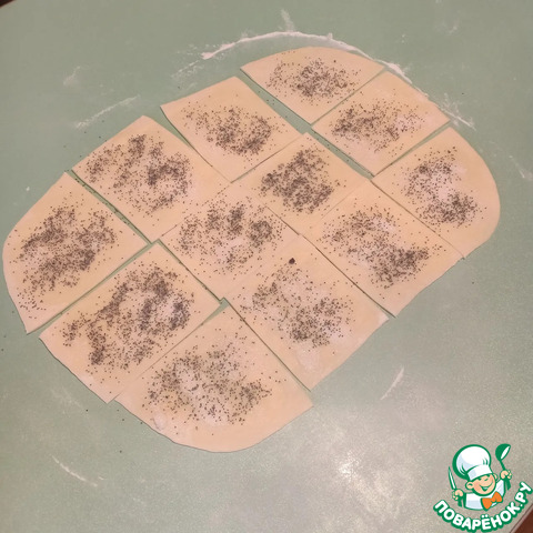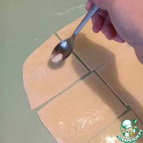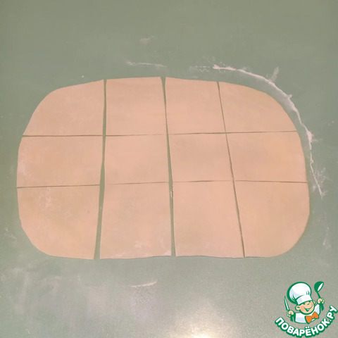 Далее, выложить тесто на стол и разделить его на 2 части. Каждую часть раскатать в пласт, толщиной 3мм. Разрезать их на квадраты со стороной примерно 8х8см.