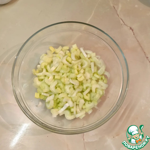 Сельдерей помыть, срезать кончики черешков и нарезать средними кусочками.