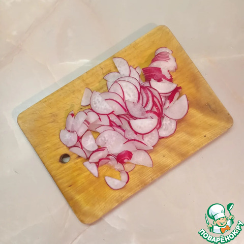 Редис помыть, обрезать кончики и нарезать полукружьями.