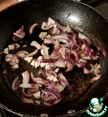 • В достаточно глубокой сковороде на малом огне разогрейте оливковое масло, добавьте лук и готовьте его 20 минут до размягчения. Затем добавьте чеснок и жарьте его минуту.