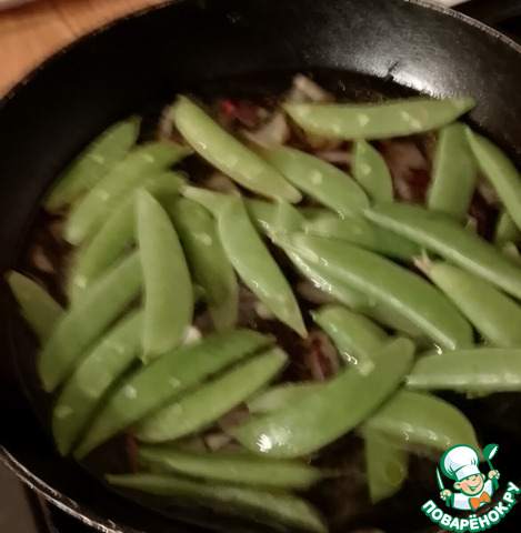 • В сковороду добавьте стручковый горох, 100 мл воды, соль и перец по вкусу. Увеличив огонь, доведите до кипения, затем уменьшите огонь и под крышкой тушите еще 8 минут.