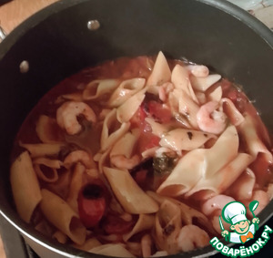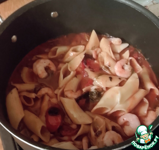 Соединить пасту с томатным соусом, добавив креветки и обуглившиеся помидоры.