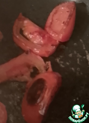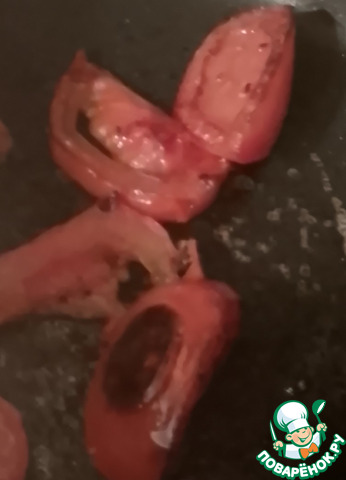 В казане на сильном огне разогреть чайную ложку оливкового масла, добавить помидоры и готовить пять минут, время от времени потряхивая сковороду. За это время помидоры должны обуглиться и частично подгореть. Убрать их с огня.