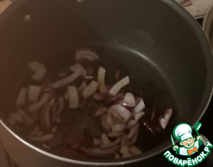 В том же казане на среднем огне разогреть 2 столовые ложки масла, добавить лук и жарить его 5 минут.