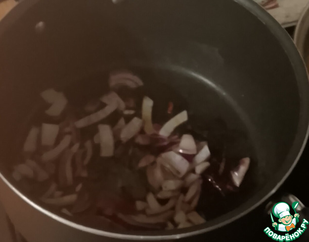 - Лук красный (нарезанный полукольцами, можно заменить луком репчатым) — 1 шт