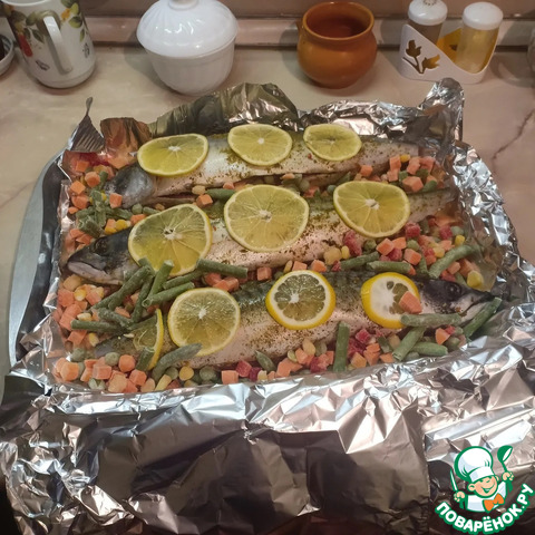 В форму для запекания уложить фольгу таким образом, чтобы уложив на нее рыбку, можно было свободно накрыть ее оставшейся частью фольги, образовав герметичный конверт. Овощи и скумбрию в специях уложить в форму для запекания на фольгу, смазанную растительном маслом. Я брала готовую замороженную смесь овощей.