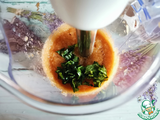 Оборвать листики базилика, промыть, обсушить и нарезать. Взбить блендером до однородного состояния.