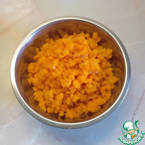 Тыкву очистить от кожуры и семечек и натереть на крупной тёрке или нарезать мелкими кубиками.