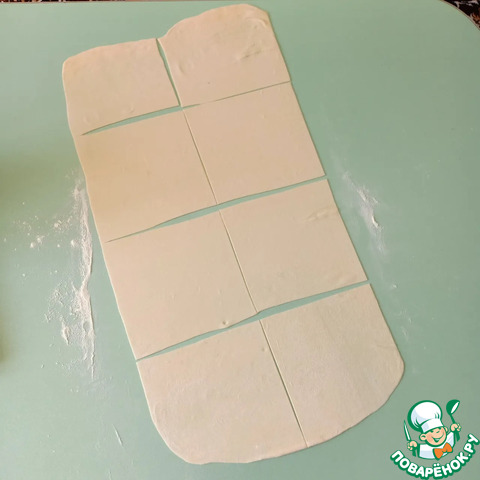 Раскатанное тесто нарезать на квадраты размером 15х15 см.