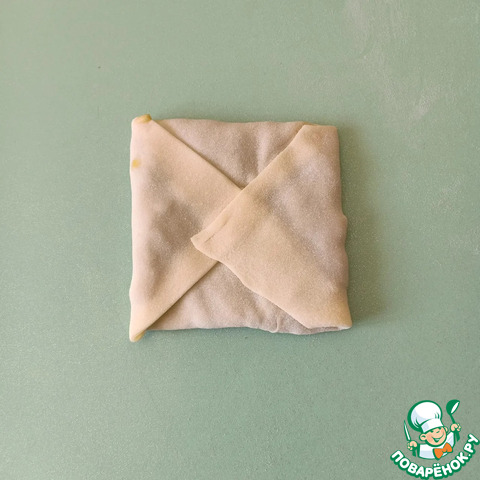 В центр каждого квадрата тонким слоем выложить начинку и сложить пирожок конвертиком.