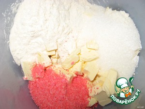 Добавляем муку, сахар и кокосовую стружку (у меня розовая... как цветы сакуры...)