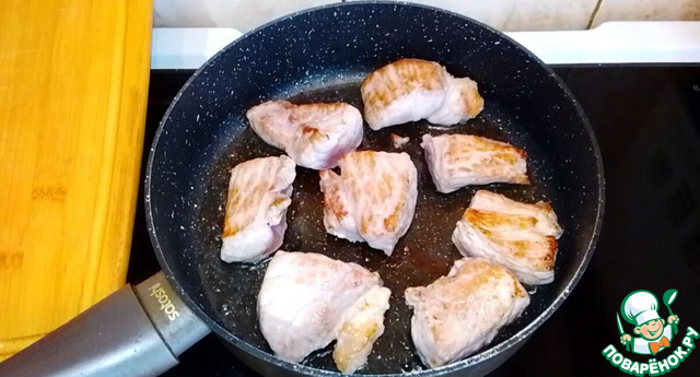 Мясо выложите в сковороду, посолите и поперчите по вкус. На сильном огне обжарьте свинину с двух сторон до золотистой корочки. Примерно по 3-4 минуты с каждой стороны.